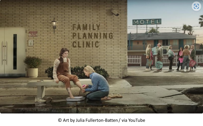 In most of the foot washing depictions, the one washing the feet (the police officer, the abortion protester, the cheerleader, the white suburban women, etc.) is supposed to be the “type” of person who looks on the “type” of person whose feet are being washed in disdain. They are the Christian, establishment, “normal” citizens being called out by…. themselves (the He Gets Us folks) regarding the attitudes and the lack of empathy and love that has been shown toward people who look different and have had different life experiences from their own.